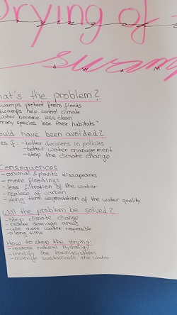 Cette journée s’est entièrement passée au lycée. Nos collègues ont d’abord demandé aux élèves de jouer à un jeu vidéo, dont le but est de gérer l’approvisionnement en eau de la ville de Grudziądz en Pologne au moyen-âge. Puis d’utiliser une intelligence artificielle pour compléter leur compréhension des problématiques liées à l’eau et Grudziądz. Ensuite, il a été demandé aux élèves de reconstituer leurs groupes de lundi pour mener de nouvelles recherches, sur le même principe que la dernière fois, avec des thèmes renouvelés, tels que : l’inondation de Hambourg en 1962, les microplastiques dans les rivières européennes, les causes des sécheresses en Europe, le niveau d’eau dans le Rhin. Les élèves ont présenté oralement les résultats de leurs recherches à l’ensemble des personnes présentes. Enfin, ils ont réalisé des panneaux/posters pour rendre compte de ce qu’ils ont appris ou retenu pendant les différents ateliers mis en place quand ils étaient au lycée le lundi et le jeudi. Une petite soirée a été organisée au lycée, avec un autre groupe français de Bordeaux participant également à un échange Erasmus+.